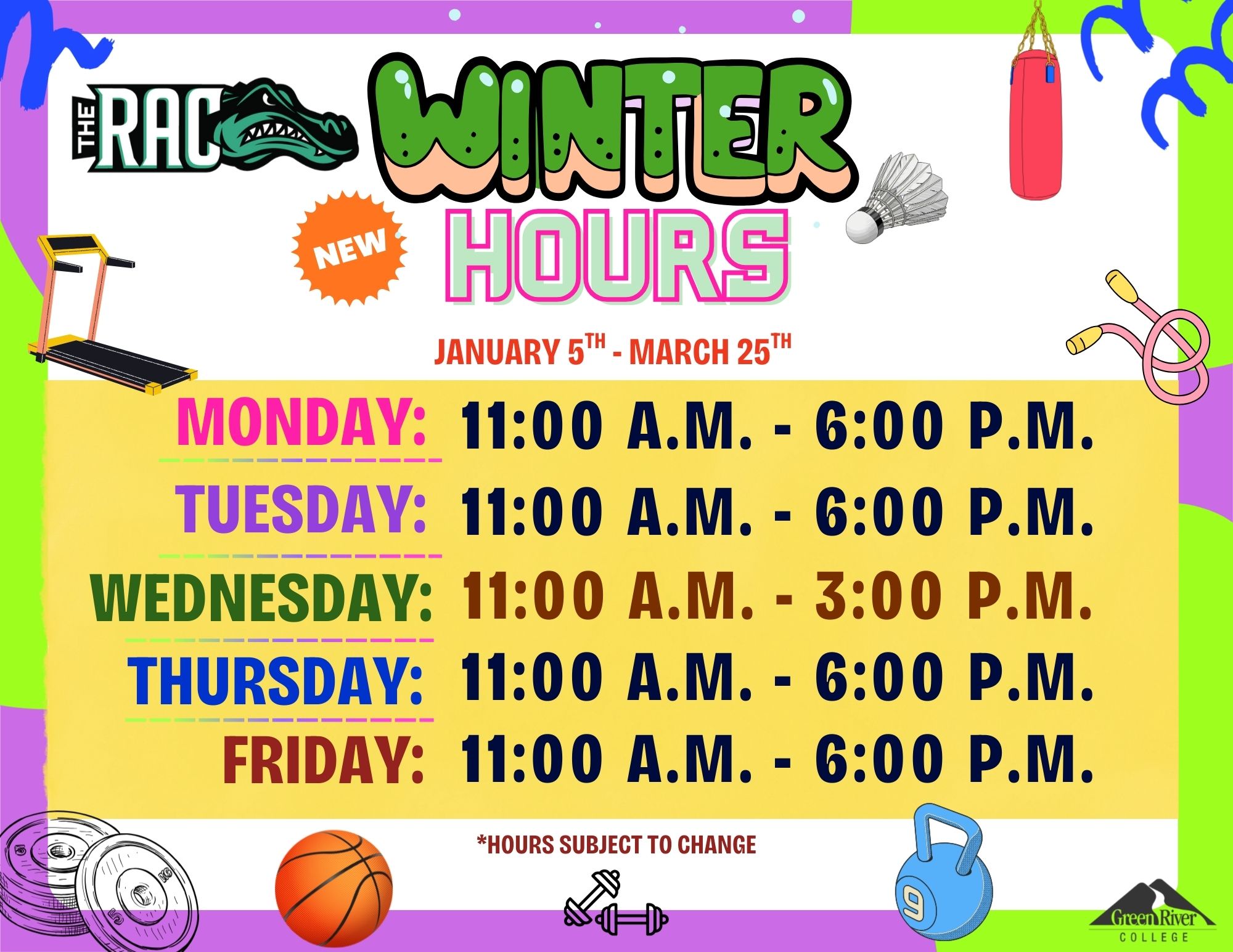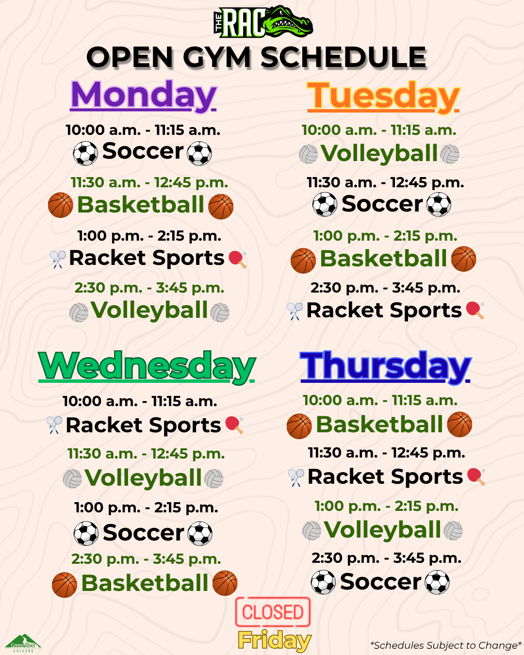 - Facility schedules are subject to change and can be found on the bulletin boards in the RAC, at the RAC front desk, RAC social media, the RAC website, and on the TV screens throughout the Student Union building.