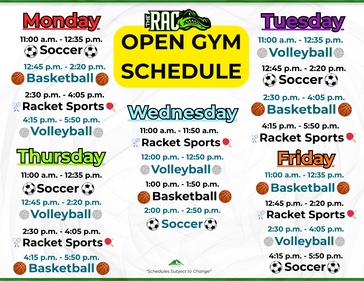 - Facility schedules are subject to change and can be found on the bulletin boards in the RAC, at the RAC front desk, RAC social media, the RAC website, and on the TV screens throughout the Student Union building.